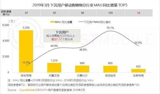 Quest Mobile在今年5月发布的《下沉市场报告》中提及,截至2019年3月底,移动互联网三线及以下城市的用户规模达6.18亿,人均使用时长增长迅速,存在巨大的人口红利。更指出,下沉用户网购热情越来越高,在移动电商细分行业用户增速均较高,并且线上消费能力也在提升;其中,生鲜电商领域月活跃用户数量同比增长50.9%,但下沉用户的电商渗透率仍低于全网,有较大的市场提升空间。